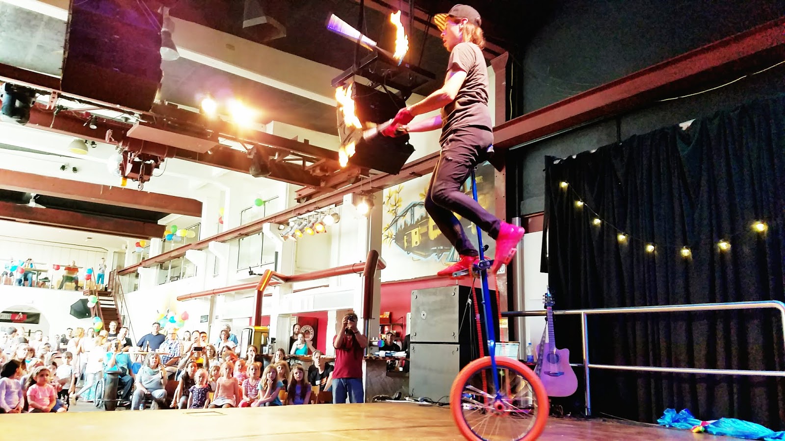 Dustin had many fans at the Festival. One of our favorites was super animated and cheered loudly throughout a show one evening. When Dustin was sharing about what led to him pursue his world championship and said he wanted to be the best unicyclist in the world, she shouted, "You are!!!" Then when he rolled out his 10 foot unicycle for the grand finale, she yelled, "Dustin for president!!!"